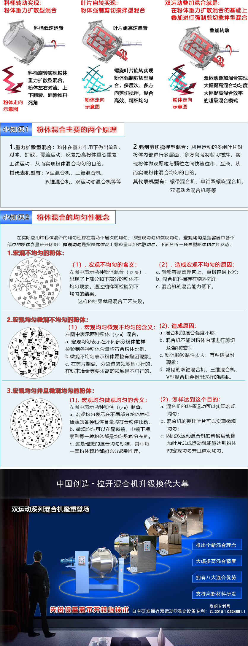 采用先進(jìn)的雙運(yùn)動(dòng)疊加混合技術(shù),在一臺(tái)設(shè)備上實(shí)現(xiàn)重力擴(kuò)散型混合和強(qiáng)制剪切型混合兩大功能。既能做到宏觀大處均勻—即讓粉體上下翻滾、左右對(duì)流進(jìn)行擴(kuò)散均勻混合;又能對(duì)粉體微觀處顆粒與顆粒之間,反復(fù)進(jìn)行多層次多方向地穿插、剪切,做到精細(xì)化強(qiáng)制混合。所以混合均勻度可以達(dá)到宏觀均勻和微觀超精細(xì)均勻的理想境界。